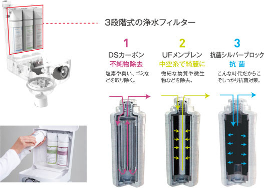 アドバンス専用浄水フィルターは、家庭用品品質表示法で定められた対象13物質を含む17物質を除去します。3本のフィルターを遠し、遊離残留塩素がもちろん、総トリハロメタン、鉛なども取り除き抗菌まで行います。
