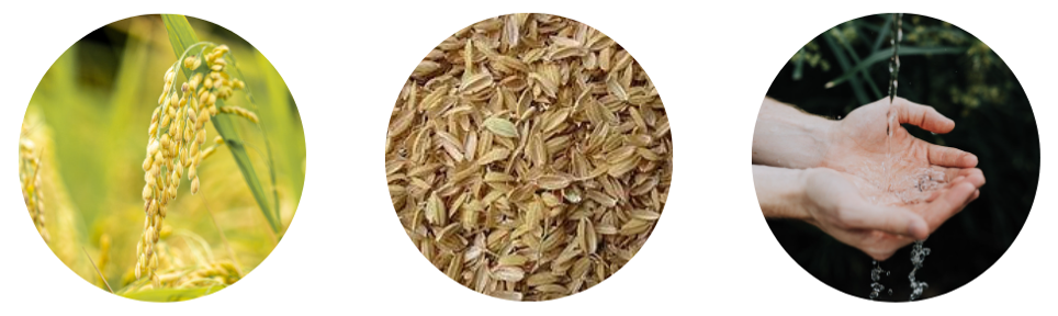 本来は大量に廃棄されるもの。アクアバンクアドバンスでは、モミ殻から生成した植物系シリカセラミックスを使用し、シリカ水を精製します。モミ殻の燃焼時に排出される二酸化炭素は、稲が成長する際に大気中から吸収したものに由来するため、カーボンニュートラルとしても扱われます。